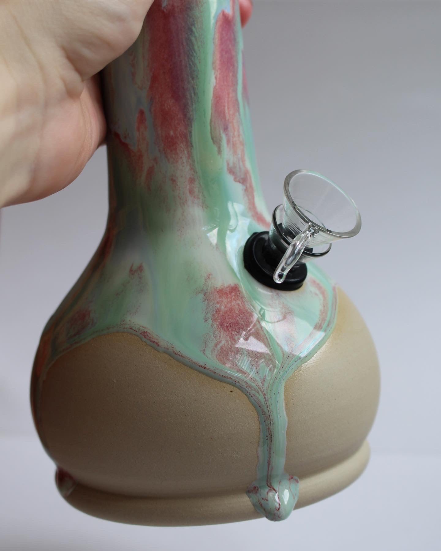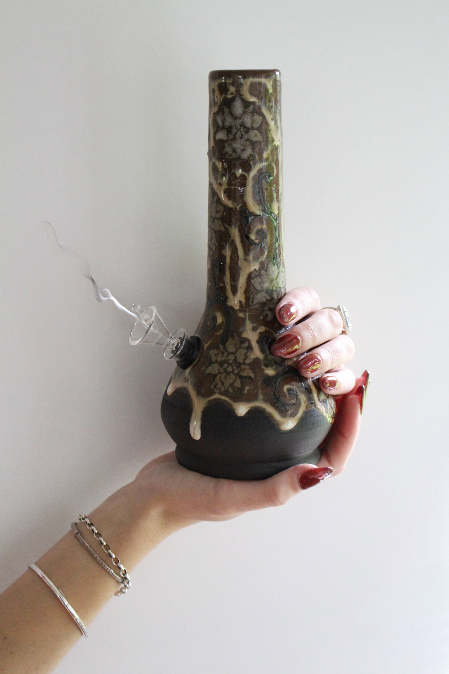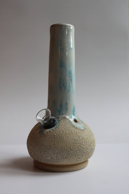 Our ceramic bongs are wheel thrown in our studio. The stoneware bongs are clear glazed inside to ensure they are water tight with no leaks and to make for super easy cleaning. All glazes used are food safe. Our ceramic bongs are fitted with a 14mm glass downstem, slider and rubber grommet.
